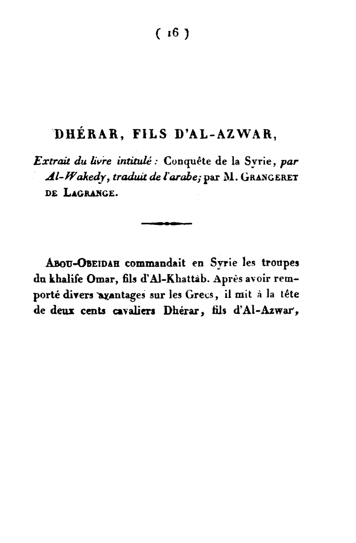 Dherar, fils d'al-Azwar. Extrait du livre intitule: Conquete de la Syrie, par al-Wakedy