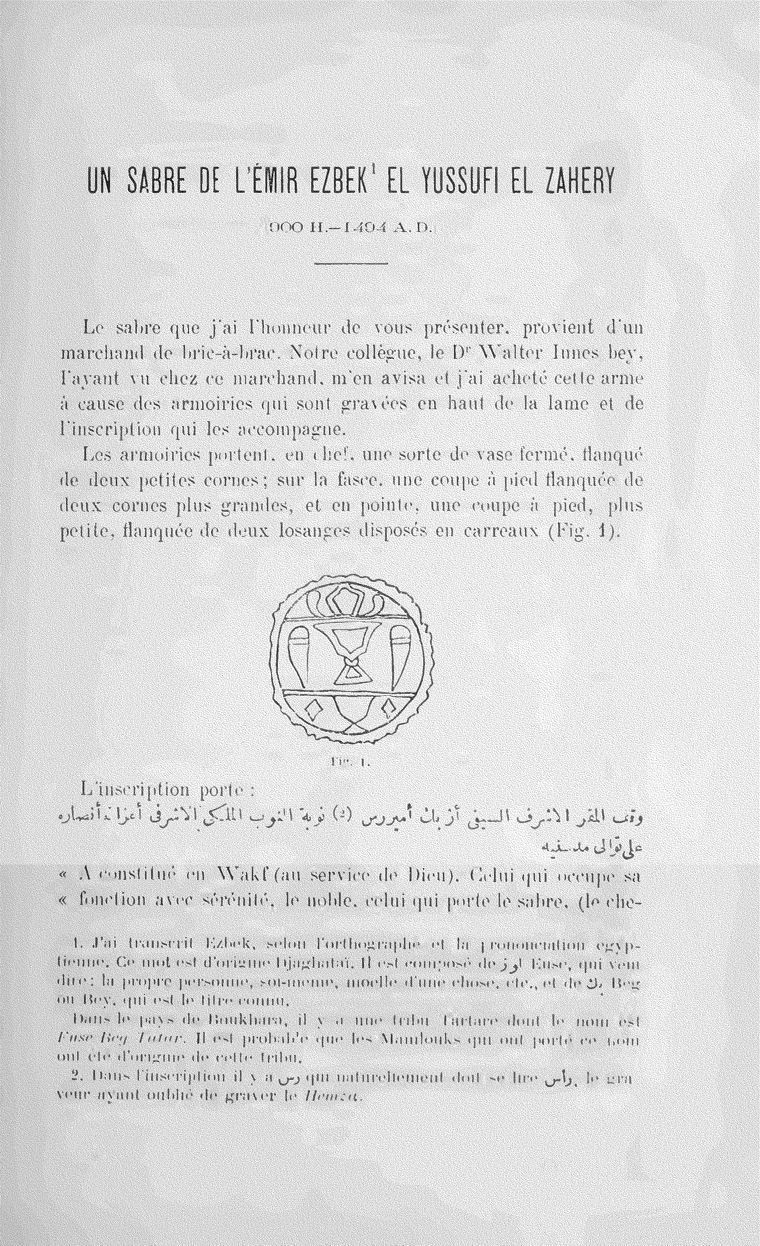 Un sabre de l'Émir Ezbek el Yussufi el Zahery (900 H.-1494 A. D.)