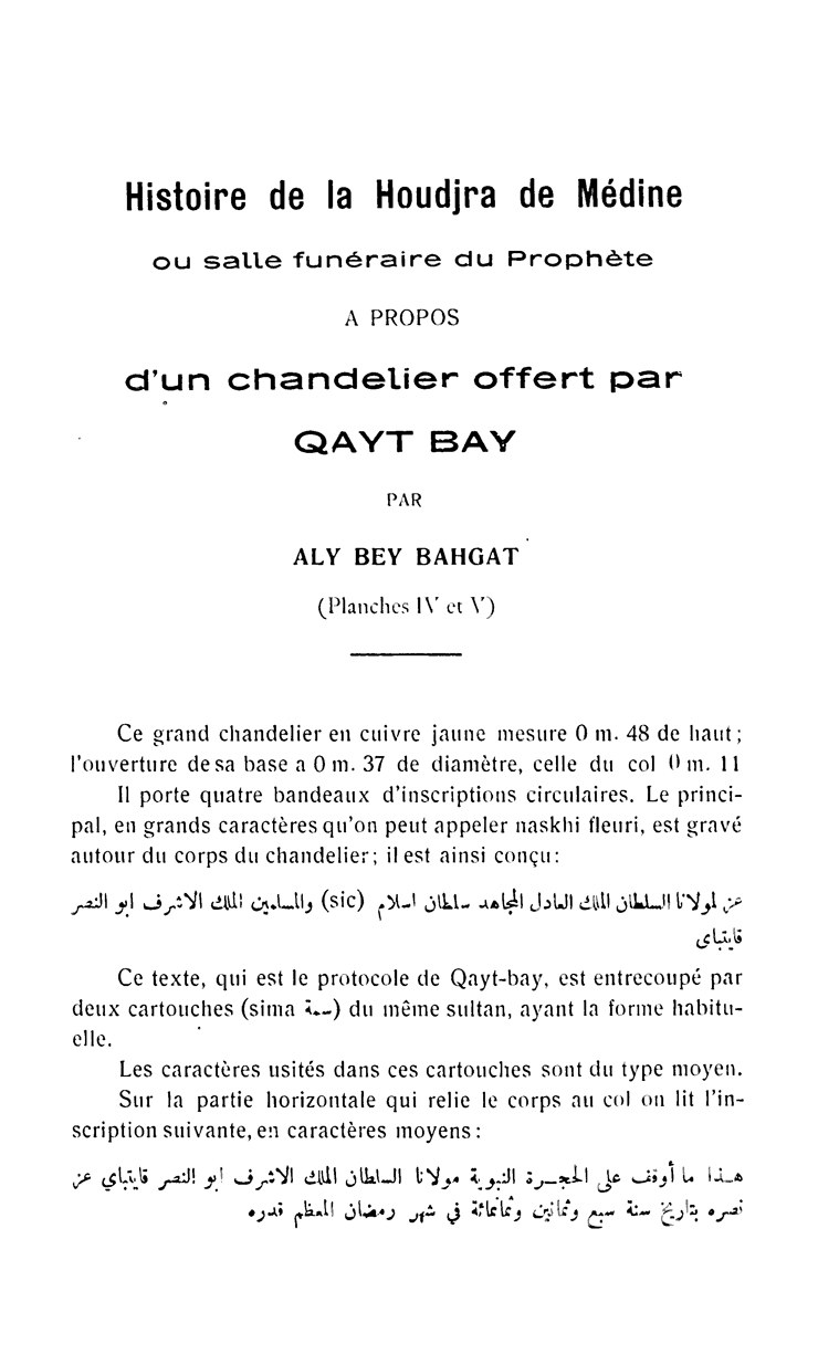Histoire de la Houdjra de Médine, ou, Salle funéraire du Prophète : à propos d'un chandelier offert par Qayt-Bay