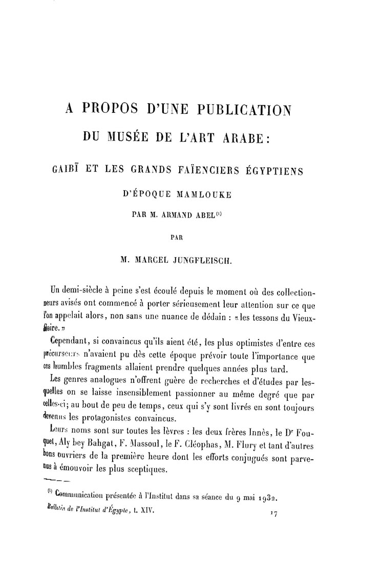 A propos d'une publication du Musée de l'art arabe : Gaibi et les grands faïenciers égyptiens d'époque mamlouke par M. Armand Abel