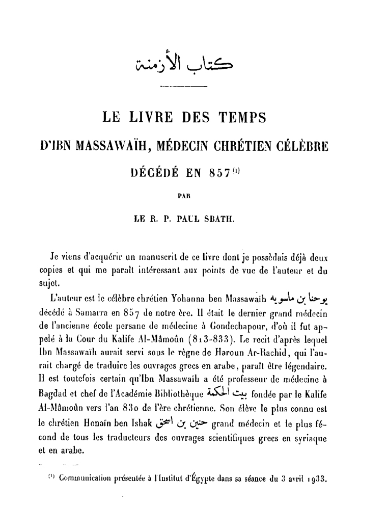 كتاب الأزمنة Le livre des temps d' Ibn Massawaih Médicin chrétien célèbre décédé en 857