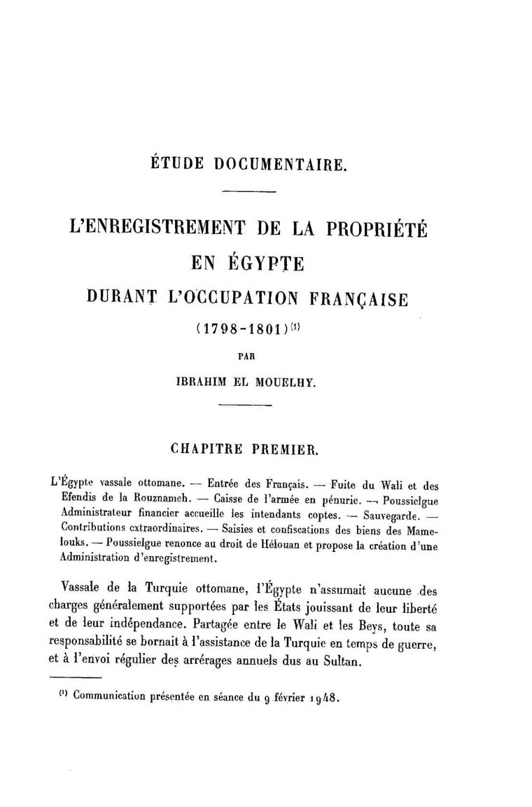 Etude documentaire . L'Enregistrement de la propriété en Egypte durant l'occupation française ( 1798-1802 )