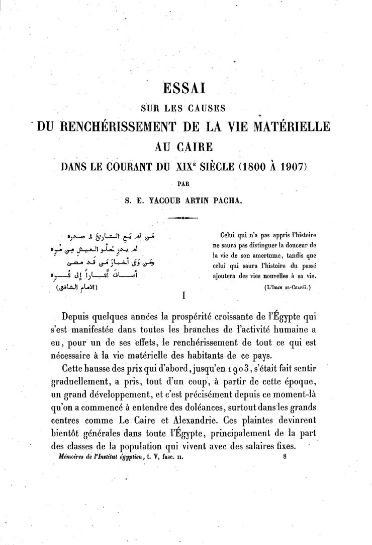 Essai sur les causes du renchérissement de la vie matérielle au Caire dans le courant du XIXe siècle (1800-à 1907)
