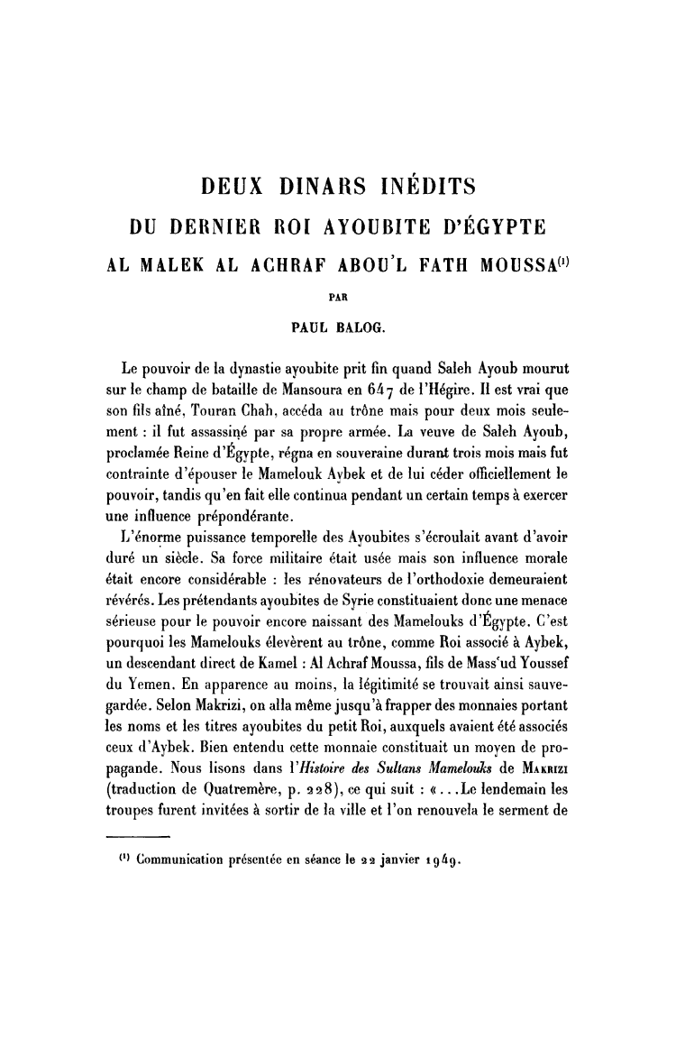 Deux dinars inédits du dernier roi Ayoubite d'Egypte al Malek al Achraf Abou'l Fath Moussa