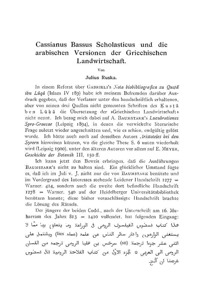 Cassianus Bassus Scholasticus und die arabische Versionen der griechischen Landwirtschaft