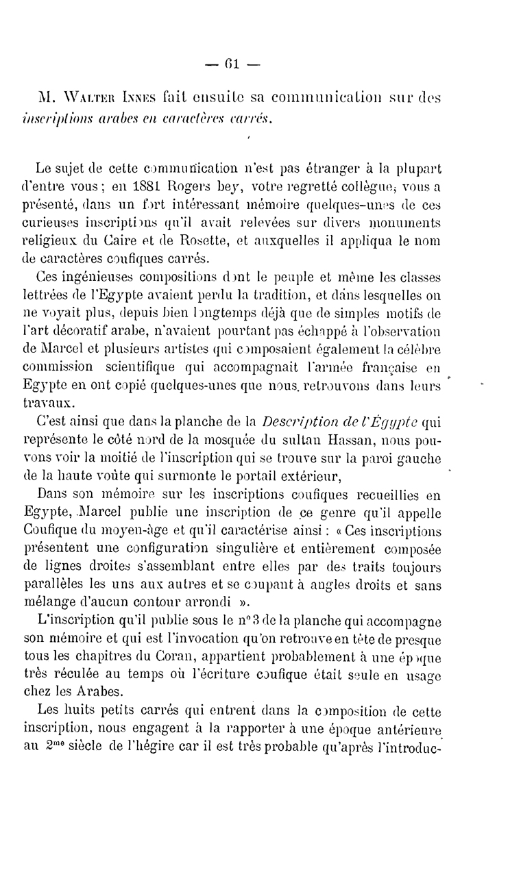 M. Walter Innès fait ensuite sa communication sur des Inscriptions arabes en caractères carrés