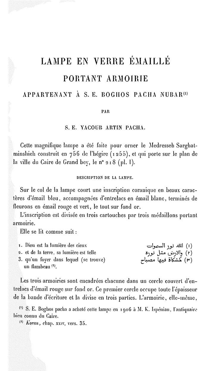 Lampe en verre émaillé portant armoirie appartenantà S.E. Boghos Pacha Nubar
