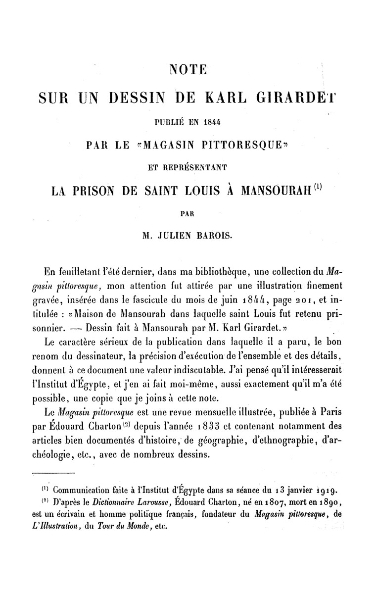 Note sur un dessin de Karl Girardet publié en 1844 par le "magasin pittoresque" et représentant La prison de Saint Louis à Mansourah