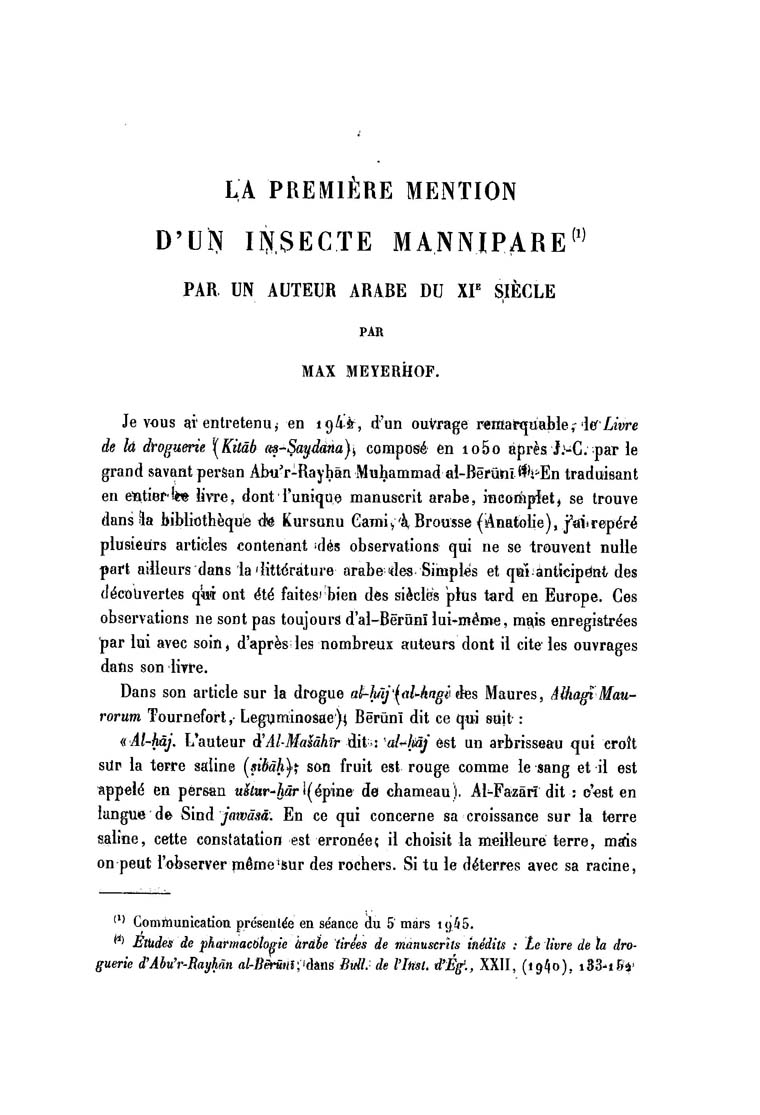 La première mention d'un insecte mannipare par un auteur arabe du XIe siècle